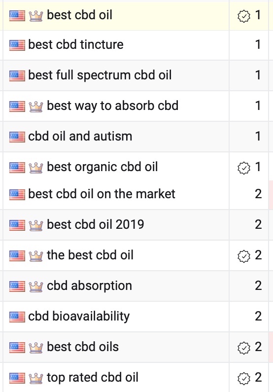 A sample of the keywords I was ranking for (note: the keywords with the crown = featured snippet)